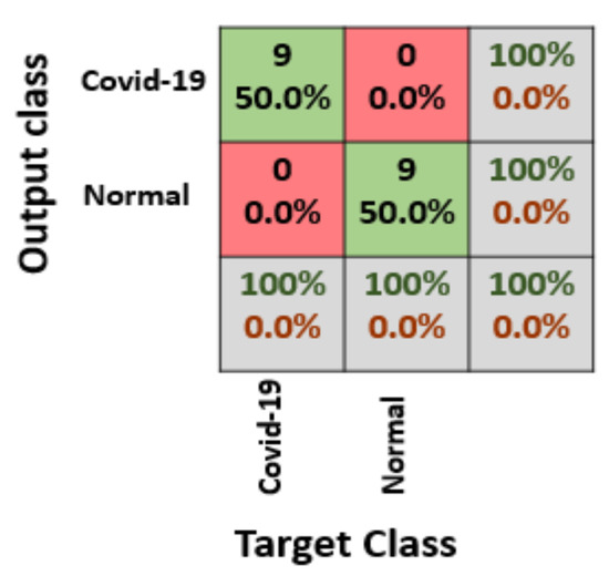 The third scenario to be tested when the dataset only includes two classes, the covid class, and the normal class. Figure 13 illustrates the confusion matrix for the three different transfer models for validation accuracy, While the confusion matrix for testing accuracy is presented in Figure 14 which is the same for all the deep transfer models selected in this research.