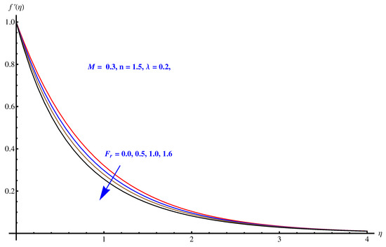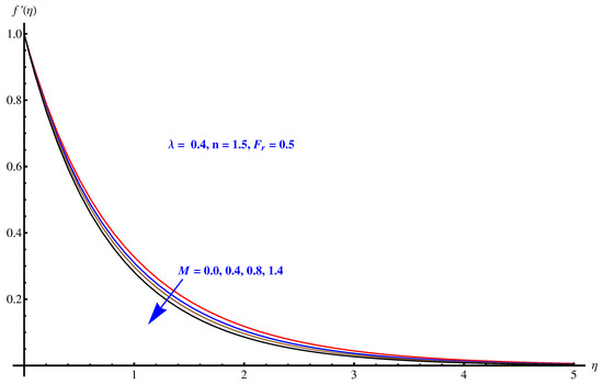 In Figure 2, Figure 3 and Figure 4, we have evaluated physical behavior of velocity field for variation in different parameters involved in momentum equation. In particular, Forchheimer number (), porosity factor (), magnetic (MHD) field effect on fluid flow is analyzed graphically. Figure 2 illustrates impact of Forchheimer number on velocity field and corresponding boundary layer. Continuous enhancement in resistance offered to fluid motion by inertial factor results in smooth decay in velocity profile. In Figure 3 we see the plot of impact of porosity factor imparted on fluid flow (velocity field) and corresponding boundary layer formulation. We observe that porous medium offers more retardational force (friction) which continuously diminishes the velocity of liquid. Boundary layer becomes thinner. Impact of Lorentz forces generated by applied magnetic (MHD) field on fluid flow and corresponding boundary layer thickness is plotted in Figure 4. Effective magnetic (MHD) field to the surface normal along vertical axis creates sudden bumps and hurdles in the way of fluid movement that causes a declination in the fluid motion. The stronger the impact of MHD, the lesser the fluid movement along the horizon.