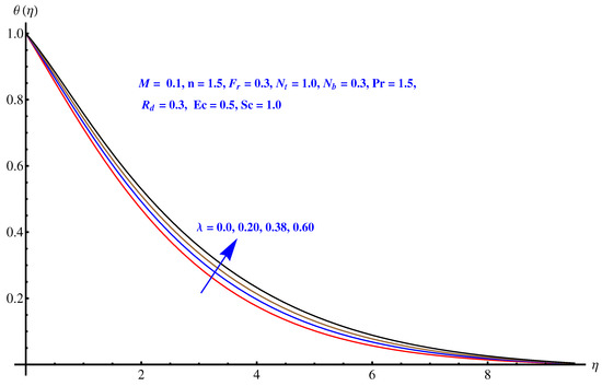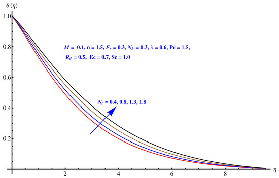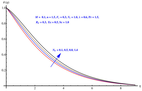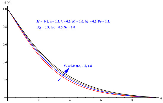 Figure 5, Figure 6, Figure 7, Figure 8 and Figure 9 are graphical results related to the parameters involved in momentum and energy equations to see variations in given domain. Since the article mainly emphasis on Darcy relation, therefore, Forchheimer number and porosity factors are two important parameters that vary the temperature distribution. Furthermore, thermal radiation is another important factor. Besides these, the impact of Brownian diffusion and thermophoresis influence on thermal state (distribution) are also noted herein. In particular, Figure 5 and Figure 6 display the consequences of inertia and porosity factors on thermal distribution, respectively. The resistive force due to inertia and enhanced friction are the source of enhancement in heat convection. Temperature distribution rises for rising values of both the factors whereas, opposite behavior is observed for anti-augmented numerical values. Impact of Brownian diffusion and thermophoresis is given in Figure 7 and Figure 8, respectively. An intensive thermophoretic force gives rise to the in-predictive motion of the nanoparticles that rises the field temperature and corresponding boundary layer shows more thickness. Influence of thermal radiation factor () is plotted in Figure 9. A certain rise in thermal state (distribution) is noted for elevated numerical values of thermal radiation factor.