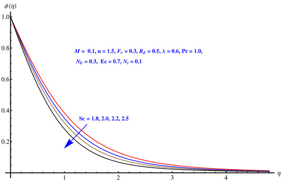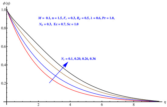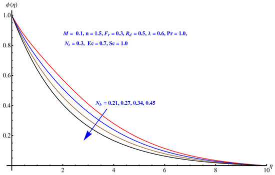 Figure 10, Figure 11 and Figure 12 are plotted to see the impact of Brownian diffusion, thermophoresis and Schmidt number on concentration of nanoparticles. In particular, Figure 10 is a plot of variations recorded in concentration distribution for rising values associated with Brownian diffusion. The concentration of the nanoparticles reduces near to surface. An enhancement is noted in case of thermophoresis due to the stronger thermophoretic force, which effectively produces more in-predictive movements as shown in Figure 11. Variation noted in concentration field for rising numerical values of Schmidt number is plotted in Figure 12. A decline is observed in the respective field. Physically, the inverse relation of Brownian diffusion and kinematic viscosity gives rise to this behavior in concentration profile.
