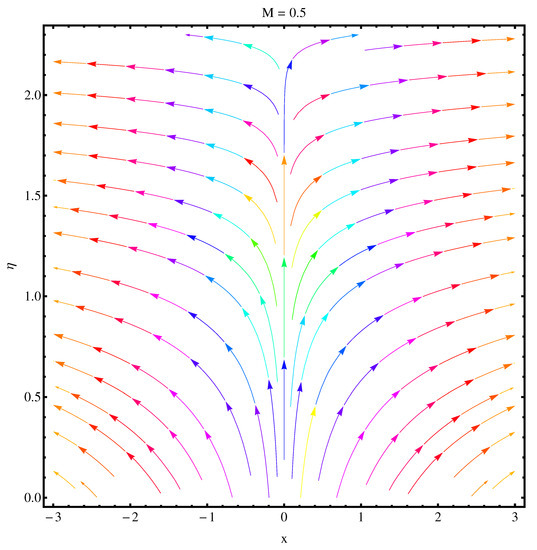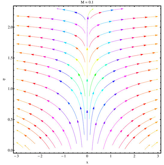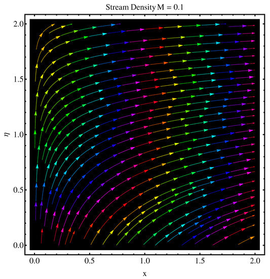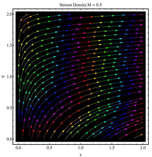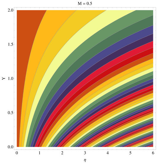 We have sketched stream functions as well as contour graphs at different numerical values of magnetic parameter M given in Figure 13, Figure 14, Figure 15 and Figure 16, respectively. In particular, Figure 13 and Figure 14 are the contour graphs given at and . An enhanced variation can be seen at the distance much away from origin. Near the origin, this variation is very narrow. Figure 15 and Figure 16 are stream functions graphs at and , respectively. A very narrow variation is noticed between two pictures. On a closer look, one can see that at the curves are not spread much as compared to the case . Physically, the stronger magnetic effect boosts the opposing Lorentz forces which occur in the way of fluid motion and stream lines get affected, whereas Figure 17 and Figure 18 present the stream density at and , respectively.