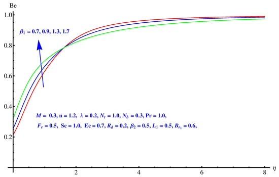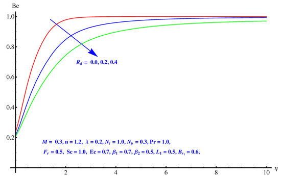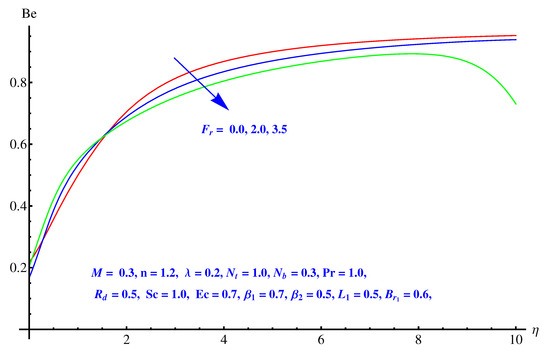 Figure 19, Figure 20 and Figure 21 are given on variations noted in Bejan number for various values of inertia factor, thermal radiation and temperature difference ratio parameter. In particular, Figure 19 shows the behavior of Bejan number with respect to the elevated values of Inertia factor. The effect is narrowed near the surface, however a comprehensive change is noted away from surface. Physically, irreversibility enhances due to friction offered by porous media to fluid and nanoparticles. A certain decrease is noted in Bejan number for elevated values of thermal radiation shown in Figure 20. Physically, larger emission rate of radiation impacts on Bejan number which shows reduction. A mixed behavior of Bejan number is noted for temperature difference ratio parameter. After a certain value, rising nature switches back to the declining trend as shown in Figure 21.