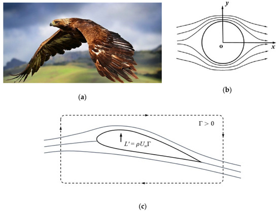 Flow past an object. (a) Flight of an eagle; (b) flow past a circular cylinder; (c) flow past an airfoil.
