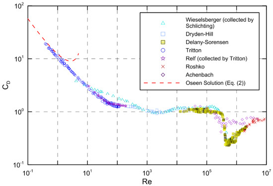 It is well known that in a viscous cross flow, the drag acting on a circular cylinder is due to friction and inertia. Earlier efforts and significant contributions were made by Stokes [40], Oseen [41], and Lamb [42] to obtain theoretical solutions for creeping flows. Van Dyke [43] introduced the development of theoretical solutions for spheres and circular cylinders. A first approximation for the drag coefficient on a cylinder is known as the Oseen solution, and it is expressed as follows [41]