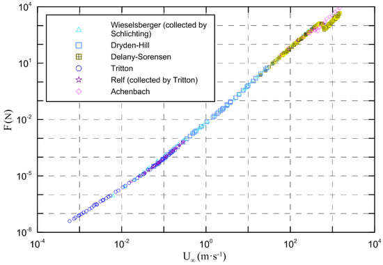 It is intuitive to people that the resistance of a moving body increases rapidly with velocity. For bluff-body flows, trend graphs of resistance and velocity over a broad range of Re are rarely seen in the literature, especially for flow around circular cylinders. Based on the results of previous experimental studies [48,49,50,51,52,53], a resistance-velocity diagram over a broad range of Re numbers was obtained, and it is illustrated in Figure 3. The relative velocity range is from 1.5 × 10−3 to 1.5 × l03 m/s, which roughly covers all the flow conditions that exist in nature and in engineering applications, and the corresponding Reynolds number range is from 1 to 106.