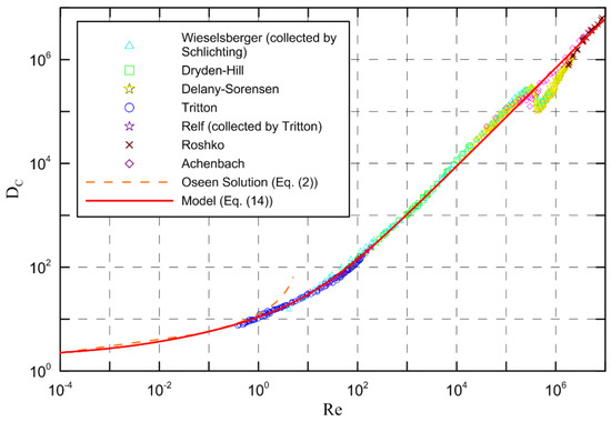 A literature survey shows that drag correlations for a wide range of Re numbers are rarely reported. In particular, there is no such correlation for drag in the entire range of Re numbers. The old drag coefficient diagrams were used in almost all the relevant literature and texts. When researchers verify the accuracy and reliability of the results they have obtained, they all have to use traditional drag coefficient diagrams. Therefore, a new drag coefficient diagram with rich and reliable data and a general drag model is necessary. Based on this situation, we extensively collected historical experimental data and mapped them on the latest drag coefficient-Re diagram (Figure 2). The historical experimental data collected by Schlichting [48] and other experimental results from Dryden and Hill [49], Delany and Sorensen [50], Tritton [51], Roshko [52], and Achenbach [53] for the drag coefficient of circular cylinders all fall on a single curve. The new drag coefficient diagram refers to a wide range of Re numbers and can greatly facilitate engineering applications, and it can be updated in the texts of fluid mechanics and heat transfer, since it is of great significance to teaching and scientific research.