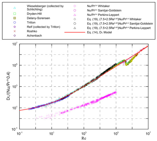 The above model for circular cylinders is presented as (7.5 + 2.5Re0.45)Nu/Pr0.4, and it is compared with the drag experimental results in Figure 5. The flow and heat transfer data in Figure 5 come from experimental studies, in which the heat transfer data were collected by Whitaker [70], and other experimental data were from Sanitjai and Goldstein [71] and Perkins and Leppert [72]. The presented model does provide a means to approximately predict the Nusselt number for the whole range of Reynolds numbers, even if no experimental results exist! In particular, this may be quite important due to the lack of information on heat transfer for high-Reynolds-number flows in the literature. In addition, the obtained results also provide a theoretical basis for the design and optimization of the shape and thermal barrier coating system of high-speed aircrafts.