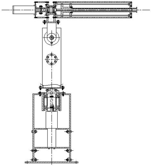 The symmetry principle was applied in the modeling method. According to the characteristics of the subject, after referring to the “Typical Industrial Robot Atlas”, the following scheme is initially determined as shown in Figure 1. The boom rotates with a planetary gear reducer, the arm rotates with a two-stage synchronous belt, and the telescopic shaft is driven by a screw nut. This kind of scheme mainly considers the simplification of the transmission chain and the structure. The first scheme is characterized by: (1) The first degree-of-freedom adopts a planetary gear reducer, which is suitable for the structural features—high reduction ratio, small volume, light weight, high precision, small backlash, large carrying capacity, low noise, and high efficiency. Furthermore, positioning and installation are easy, and the price is not high due to the use of standard articles. (2) The second degree-of-freedom adopts the two-stage synchronous serrated belt to reduce the speed, which makes full use of the space of the boom, compact structure, constant transmission ratio, large transmission power, and high efficiency. However, there are certain requirements for installation, and some devices need to be adjusted. (3) The third degree-of-freedom is driven by a screw nut. The motor directly drives the screw nut transmission with the function of deceleration. Thus, the rotary motion can be converted into linear motion in one step with high transmission precision. Besides, the screw has a self-locking function for the speed that should not be too high [13,14].