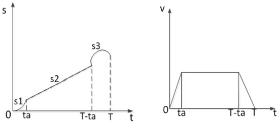 If necessary, the path interpolation in the joint coordinate space is performed on the joint variable spatial sequence obtained by inverse kinematics. Generally, when the motion controller performs motion axis servo control, it will interpolate the joint specified variables [16,17,18]. There are two ways to interpolate the rate curve, which are trapezoidal graphic mode and S-shaped graphic mode.