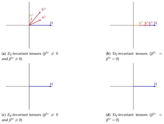Since in 2D, each of the harmonic tensors , , and has two independent components. Therefore, we can represent them as vectors in appropriate orthonormal bases for and . As in [38,39], for we choose the basis with:
