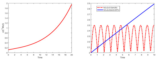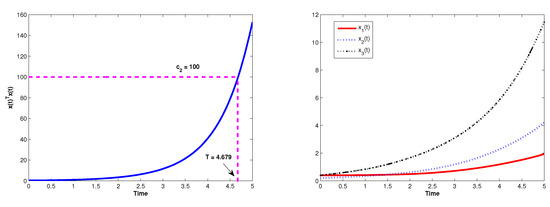 and the delay function satisfying ; the uncertain parameters are given by . With an initial condition , the solution of the system are shown in Figure 3. One can notice that the trajectory of diverges as . To further investigate the (R)FTS and (R)FTU, we can choose values of that satisfy the given initial condition and delay function above.