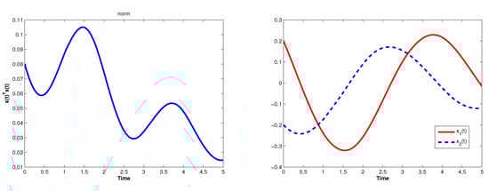 We investigate the FTS of the system with the delay function given by and the initial conditions satisfying . With the given initial condition and delay function, we choose . The solution of this system is shown in Figure 2. We observe that the linear system is asymptotic stable with oscillation at the early state. Thus, it is worth to investigate and compare results of FTS of the system for a short period of time; e.g., .
