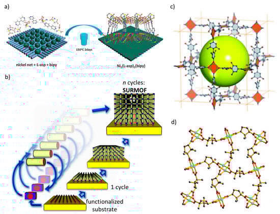 Chiral MOF films can be prepared by various methods; for instance, by one-pot solvolthermal film syntheses on the substrate, as shown in Figure 1a [18]. A particularly interesting method for the MOF film preparation is the layer-by-layer (lbl) synthesis based on liquid-phase (quasi)-epitaxy, resulting in surface-mounted MOFs (SURMOFs), as shown in Figure 1b [19,20]. There, the MOF components are consecutively deposited on an appropriately functionalized substrate. In addition to the control of the film thickness and the small surface roughness [21,22], SURMOFs typically have a low defect density, resulting in a high transparency of the material [23,24] and fast uptake and release kinetics [21,25].