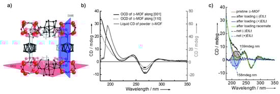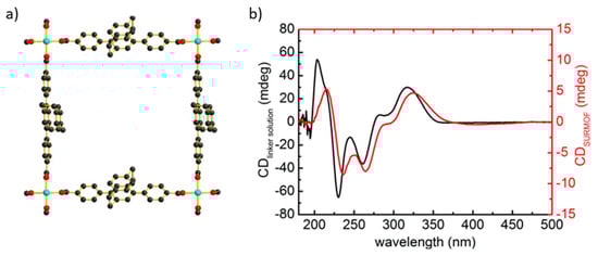 Planar chiral paracyclophane. (a) The structure of SURMOF-2 Cu(PcTPDC). Carbon is shown in black, oxygen in red, and copper in cyan. Hydrogen is not shown. The center ring of the terphenyl dicarboxylic acid (TPDC) linker possesses an oriented paracylophane group, causing its chiral character. (b) The CD spectra of the PcTPDC molecule in ethanol solution (black) and in the SURMOF structure (red). Reprinted with permission from [29]. Copyright 2015, The Royal Society of Chemistry.