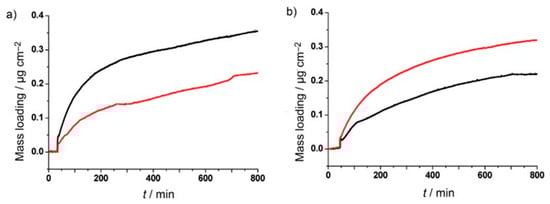 Enantiopure uptake of R-HDO (black) and S-HDO (red) by Zn2(Dcam)2(dabco) (a) and by Zn2(Lcam)2(dabco) (b). The data are recorded with a QCM. Reprinted with permission from [43]. Copyright 2012, Wiley-VCH.