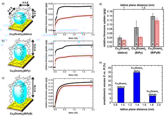 In addition to the chiral center, the pore structure and the achiral components of the MOF are also crucial for the enantioselective host–guest interaction. A series of isoreticular chiral SURMOFs with identical chiral linkers but different pore sizes were prepared, namely Cu2(Dcam)2(dabco), Cu2(Dcam)2(BiPy), and Cu2(Dcam)2(BiPyB), as shown in Figure 5 [44]. (BiPy stands for 4,4’-bipyridine and BiPyB for 1,4-bis(4-pyridyl)benzene.) While the lattice distance in the [001] direction varies between 0.95 nm and 1.8 nm, the parameters for the lattice planes perpendicular to [001] are identical. As expected, the QCM data show that the adsorption capacity of the SURMOFs increases with increasing pore size. However, the enantioselectivity does not follow such a simple trend, and the medium pore size shows the highest enantioselectivity (Figure 5d). The different enantioselectivity is caused by the different alignments of the chiral guest molecules adsorbed in the pores, where the stereogenic center has a different impact on the enantiomer selectivity. It may be hypothesized that the ideal pore size, where the chiral center has the highest impact on the host–guest interaction, resulting in the highest enantiomer separation, is roughly as large as the guest molecule. For “too” small pores, the guest molecules are “forced” to adsorb in the pores in such a position where the impact of the chiral moiety of the framework is small. For “too” large pores, the molecules can adsorb all over the large pore, and the impact of the chiral moiety is small, too (Figure 5e). A significant influence of the pore size on the enantioselectivity was also found for other MOF structures in the form of powders [45].