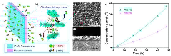 Enantioselective separation by homochiral MOF membranes. (a) Sketch of the supported MOF membrane with the Zn2(bdc)(l-lac)(dmf) (Zn-BLD) MOF structure (b). Scanning electron microscopy images of the top view (c) and cross-section (d) of the membrane. (e) Permeate concentration of R- and S-methyl phenyl sulfoxide (R- and S-MPS) as a function of time. The feed concentration is 5 mmol L−1. Reprinted with permission from [52]. Copyright 2012, The Royal Society of Chemistry.