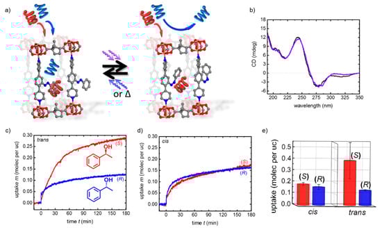 Photoswitching the enantioselective adsorption. (a) The Cu2(Dcam)2(AzoBiPyB) SURMOF in the trans (left) and cis (right) state. (b) The CD spectra of the sample in the trans (black) and cis (violet) state. The uptake curves of the sample in the trans state (c) and in the cis state (d) for R- and S-1-phenylethanol (blue and red, respectively). (e) The average values and standard deviations of the 1-phenylethanol uptakes by the SURMOF in the cis and trans states. Reprinted with permission from [54]. Copyright 2019, The Royal Society of Chemistry.