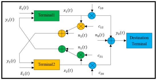 Cooperative communication is a new form of spatial diversity, in which gain of diversity is achieved via cooperation of in-cell terminals [12], that is, in each cell, each terminal has at least a partner. The model of cooperative channel is depicted in Figure 1, and it is supposed that each terminal has only a partner. Each terminal receives an attenuated and noisy version of its partner’s transmitted signal and uses it in conjunction with its own data to construct new transmitted signals. The destination terminal receives a noisy version of sum of attenuated signals of both terminals. The mathematical formulation of the model can be expressed as: