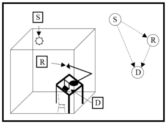 An ordinary study room is considered with dimensions of , and equipped with luminaires and furniture items, as shown in Figure 2. In this room, there are numerous luminaires; one is the main luminaire for the whole space at the ceiling, which is also called the source luminaire (S), and the others are mounted on desks to provide cooperative light, which are also called relay luminaires (R). S has direct access to the backbone network, e.g., CHINANET. Relay luminaires are selected according to the distance between S and R. S will choose relay luminaires according to the channel correlation coefficient of the transmitting domain between S and R. The destination receiver (D) is in the form of a USB device which is connected to a computer. In this room, S is only fixed with the module for transmitting VLC signals, and all relay luminaires are fixed with modules for transmitting and receiving VLC signals, while D is only fixed with the module for receiving VLC signals.