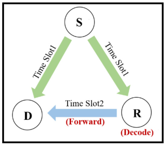 For simplicity, a cooperative indoor VLC system with three terminals was studied in this paper, which were S, R, and D. The process of cooperative transmission was illustrated in Figure 3. In this process, only one relay luminaire was selected to cooperate, and the decode and forward (DF) protocol was adopted at R, with all terminals worked in half-duplex mode, and the optical signal was modulated by M-QAM/M-PSK. The maximum ratio combining (MRC) was employed at D. During the first time slot, S transmitted source data to R and D via broadcasting, R received and detected, while D only received. During the second time slot, R forwarded relay data once the received data in the first time slot was detected correctly, and D received and then detected the combined data from S and R. Otherwise, if received data in the first time slot was not detected correctly, D directly detected received data which was transmitted from S in the first time slot.