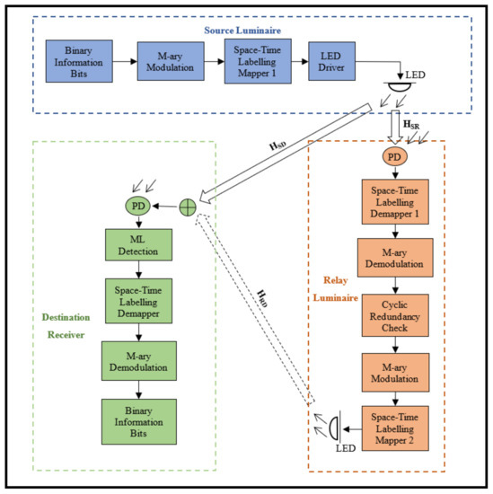 This paper is organized as follows. Section 2 presents related knowledge and theory with regard to cooperative communication and space–time labeling diversity. Section 3 first describes a model of cooperative indoor VLC systems, and then introduces space–time labeling diversity into the constructed model, finally deriving the BER of the proposed cooperative indoor VLC system. Monte Carlo simulations and analyses of results are found in Section 4. Finally, the conclusions of this paper are summarized in Section 5.