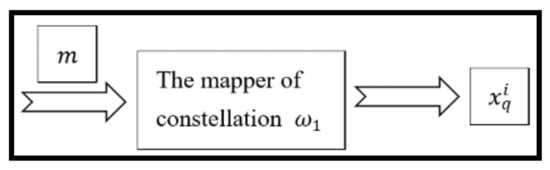 In space–time labeling diversity, the minimum Euclidean distance product of the space–time block code is adopted instead of bit interleaving or coding to maximize the coding gain of space–time coding. The principle is described as follows. We assume a MIMO system of space–time labeling diversity with transmitting antennas and receiving antennas, and any two transmitting antennas are activated to transmit information [13]. The original data were divided into two bitstreams, which are called and , where , is the order for modulation. Then and sequentially enter into two mappers of constellations, which are called mapper1 of the constellation and mapper2 of the constellation. They are also described as and . After and enter into two mappers, mapper1 of the constellation maps them onto points of the multiple quadrature amplitude modulation/multiple phase shift keying (M-QAM/M-PSK) constellation, and the output will produce two modulated signals, which are described as follows, where ,