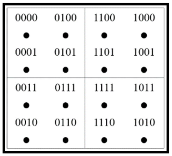 where , , . In Figure 6, taking the points of 1111 and 1110 on the constellation for example, the distance between them is 2, while the distance is 4 in Figure 8. Therefore, the distance product of the proposed scheme is , while in the scheme with amplify and forward (AF), the constellation at R is the same as that at S, the distances are both 2, and the distance product is . It can be summarized that the distance product in the proposed scheme has been expanded by 4 times, which is equal to gaining 4 times the channel between S and R.