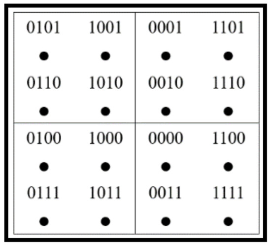 The structure diagram of the cooperative strategy based on space–time labeling diversity in indoor VLC system is illustrated in Figure 4. In this system, transmission of optical signal is in detail divided into two phases, that is, two time slots. During the first time slot, S transmits the modulated optical signal , R and D receive, then R decodes. During the second time slot, R forwards the modulated optical signal to D once binary information bits is decoded correctly in the first time slot at R. Otherwise, R does not participate in cooperation. D decodes data which are received during two time slots. The mapping of optical signals transmitted at S is shown in Figure 5, and the original constellation mapped at S is shown in Figure 6. Since the DF protocol is used in this paper, the decoding and recoding of original data transmitted from S are added at R. In a traditional cooperative VLC system, repetitive signals are only forwarded at R, and the gain of spatial coding cannot be maximized. However, the cooperative strategy proposed in this paper not only remaps optical signals but also introduces space–time labeling diversity to improve the reliability of the system. The mapping of optical signals transmitted at R is shown in Figure 7, and the original constellation mapped at R is shown in Figure 8. In Figure 5 and Figure 7, and are respectively the original constellation at S and R. The original data are passed through two mappers to produce optical signals and .