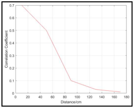 In Section 3, it was mentioned that S selects R as a partner according to the channel correlation coefficient of the transmitting domain between S and R. The channel correlation of the transmitting domain is defined as the channel correlation from different LEDs to the same photodetector. The influence of the distance between S and R on channel correlation of the transmitting domain was measured and the curve is shown in Figure 9. It was assumed that S and D were fixed in position in the space. R was moved to obtain different values of distance between S and R. It can be seen that channel correlation of the transmitting domain decreased when the distance between S and R increased. When the distance was less than 50 cm, the channel correlation was larger, which exactly matched the fact that channel correlation of MIMO is great due to the short distance between LEDs, generally below 50 cm. When the distance was more than 50 cm, the channel correlation gradually became weaker. Therefore, R whose distance is greater than 50 cm from S will be a good choice as a partner for S.