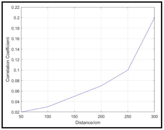 Furthermore, we also measured the influence of the distance between R and D on the channel correlation of the transmitting domain. It was assumed that S and D were fixed in position in the space. R was moved to obtain different values of distance between R and D. A surprising result is shown in Figure 10. Unlike the curve in Figure 9, as the distance between R and D increased, the channel correlation coefficient also increased, and the value of the coefficient changed in a small range. When the distance between R and D was 300 cm, the value was 0.2, and the channel correlation was not too large. The distance between R and D has only a limited impact on the channel correlation of the transmitting domain.