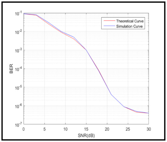 In order to verify the derived theoretical result of BER, we compared the derived theoretical BER curve and the simulation curve. It was assumed that S and R both have the same average power. D was fully aware of the channel state information of all the transmission links. In Figure 11, the red curve is drawn according to Equation (25), while the blue one is the simulation result. It can be seen that as the SNR of the channel between S and R rise, the two curves approximately coincide and both meet the lower bound, which proves that the derived formula of the joint BER and simulation algorithm are both correct.