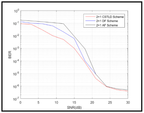 In most cooperative schemes for VLC systems, only AF or DF are employed at R. In Figure 12, we compared BER performance of different schemes in cooperative indoor VLC systems, which were a cooperative space–time labeling diversity (CSTLD) scheme, a DF scheme, and a AF scheme. In the DF scheme and the AF scheme, R only employed the DF protocol or AF protocol to forward, while in CSTLD scheme, besides the DF protocol adopted at R, the space–time labeling diversity structure was designed for S and R. It can be seen that the CSTLD scheme had an outstanding performance over the other two schemes, especially when SNR was below 15 dB. In the AF scheme, the noise was amplified with the received signal at R, which increased the difficulty of detection at D when SNR was low, especially below 12 dB. In the DF scheme, low SNR caused a decrease in successful decoding at R. In the CSTLD scheme, though the DF protocol was also adopted at R, the structure of the space–time labeling diversity greatly improved the ability to detect a signal at D. The BER performances of the three schemes tended to be consistent when the SNR was above 24 dB. These facts mean that the CSTLD scheme may be more robust when the channel condition is poor.