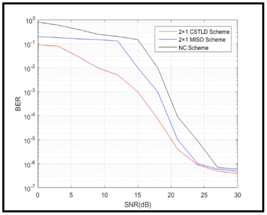 In cooperative schemes, relay luminaires were introduced to set up the structure of the virtual MIMO. The BER performances of the proposed cooperative scheme, the MIMO scheme, and the non-cooperative (NC) scheme are illustrated in Figure 13. Because the cooperative indoor VLC system was analyzed in this paper, the multiple input single output (MISO) indoor VLC system was compared. It can be seen that NC scheme obviously performed worse than the other two schemes. This demonstrated that cooperative transmission plays an important role. In the MISO scheme, gain of spatial diversity was obtained due to cooperation of R, so it had a great improvement of BER performance compared to the NC scheme. However, the values of BER of the MISO scheme and the NC scheme both remained high when the SNR was below 12 dB and 15 dB, respectively. This was mainly due to the introduction of space–time labeling diversity, which can produce a gain of spatial diversity and a gain of coding.