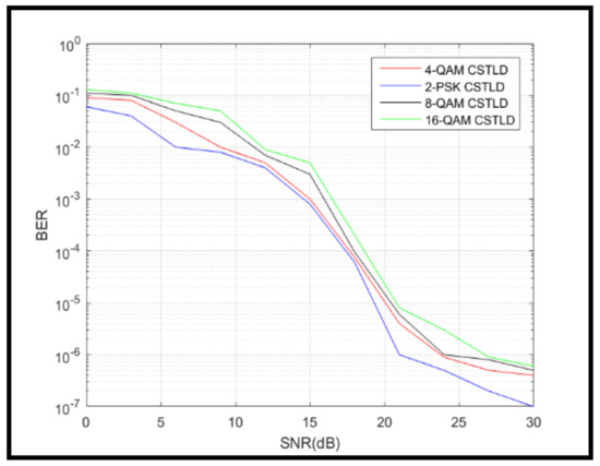 In Figure 11, Figure 12 and Figure 13, 4-QAM was employed to modulate binary bits, and the influence of the different modulation orders on the proposed cooperative scheme in the indoor VLC system is illustrated in Figure 14. It can be seen that BER performance was improved in the four schemes with different modulation orders, which were 2-PSK CSTLD, 4-QAM CSTLD, 8-QAM CSTLD, and 16-QAM CSTLD. However, subtle differences were still obtained. The 2-PSK CSTLD scheme performed the best of all. In the 2-PSK CSTLD scheme, one bit was transmitted during every time slot, which obviously caused a decrease in the transmission rate in the indoor VLC system. However, in some cases, it may be worthwhile to improve BER performance of system at the expense of decreased transmission rate. At the same time, the demodulation complexity at D can be reduced.