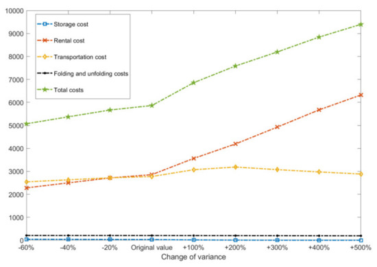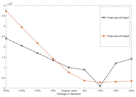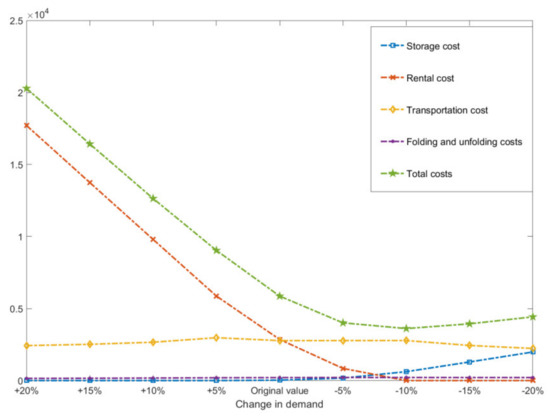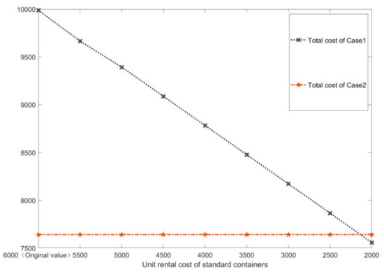 Figure 3 that when the demand increases, the total cost of both cases increases sharply, but the use of standard containers is better than that of foldable containers. This is because the system needs to rent empty containers from outside when the demand increases. Since the unit cost of the foldable container is much higher than that of the standard container, the total cost of Case 2 is higher. When the demand is low, the total cost of the two cases decreases firstly and then increases. This is because the storage cost increases sharply when the demand is small. At this time, the use of foldable containers not only reduces transportation costs but also reduces storage costs, which shows a huge advantage over standard containers.