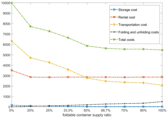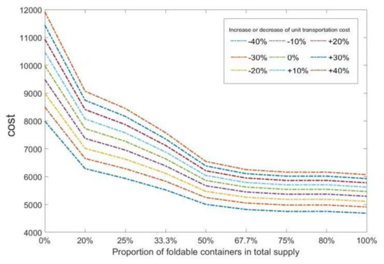 Figure 5 shows the total cost comparison for the two cases while the standard container unit rental cost is reduced. As the cost of renting a standard container decreases gradually, the advantages of using foldable containers decreases gradually. In this example, when the standard container unit rental cost is less than 2000, the total cost of using standard containers is lower.
