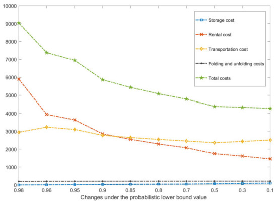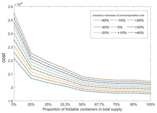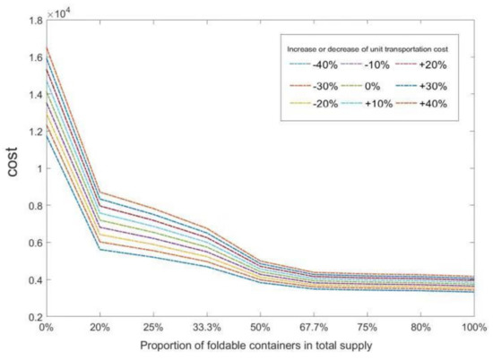 Because the lower bound of the probability of the chance constraint and the uncertain demand variance mainly affect the supply–demand ratio relationship, the unit transportation cost is related to the unit renting cost. Therefore, the unit transportation cost and the proportion of the supply of foldable containers were finally selected for analysis.
