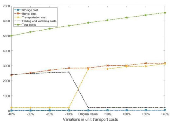 Figure 11, when the unit transportation cost decreases, the transportation cost decreases, the folding and unfolding cost increases, and the rental cost decreases. This is because the transportation volume increases, and the volume of renting decreases. Conversely, when the unit transportation cost increases, the transportation cost increases, the folding and unfolding cost decreases, and the rental cost increases. This is because the transportation volume decreases, and the volume of renting increases.