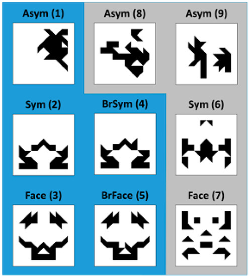 The employed stimuli were similar to those used in Gartus and Leder [27,28]. They consisted of 36 to 44 black triangles, placed in an 8 × 8 regular grid on a white background showing several types of symmetry and were generated by a stochastic optimization algorithm implemented in MATLAB R2013a (The MathWorks, Inc., Natick, MA, USA). In this study, asymmetric patterns and patterns having a vertical symmetry axis were used. In addition, we also used “broken” patterns that slightly deviated from perfect vertical symmetry [27,28]. Patterns with a vertical symmetry axis are quite often perceived as faces (the pareidolia phenomenon). To systematically study this phenomenon, 300 preselected patterns with a vertical symmetry axis were examined in three prestudies to select the stimuli for the main study.