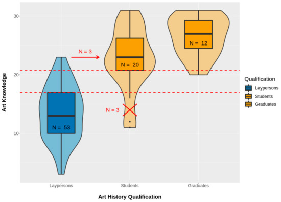 Box and violin plots of art knowledge scores for the three groups of laypersons, art history students, and art history graduates. The box plots depict the median as a bold horizontal line and the interquartile range as a box, as well as extremes and outliers, while the violin plots show a kernel density estimate of the full distribution. Note that three students of art history had very low scores of art knowledge and were removed from the sample, while three laypersons had very high scores and were therefore considered to be art experts.
