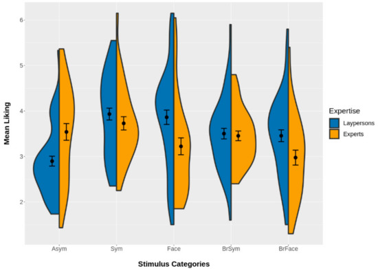 Figure 3 summarizes the means of liking scores for all five stimulus categories (Asym, Sym, Face, BrSym, BrFace) and for experts vs. laypersons. In this figure, one can already see that experts and laypersons differed in their preferences, particularly for the stimulus categories Asym, Face, and BrFace.