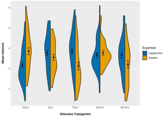 Figure 4 summarizes the means of interest scores for all five stimulus categories and for experts vs. laypersons. The (visual) results seem to be quite similar to liking and the differences between experts and laypersons showed up mostly for the stimulus categories Asym, Face, and BrFace and were in the same directions as liking.