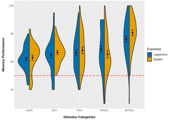 Split violin plots showing a kernel density estimate of the full distributions of mean percentage of memory performance (correct recognition) for stimulus categories and for experts vs. laypersons. The black dots depict the mean and error bars depict standard error of the mean. The dotted red line corresponds to chance level performance of 50%.