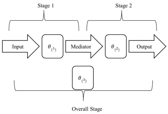 The two-stage DEA model was first presented by [7]. This model can be applied in many fields to measure different managerial abilities separately in each stage, including marketability, profitability, financial abilities, etc. In this model, a mediating factor will be employed to split the traditional one-stage DEA CCR model into two stages. This mediating factor is the output of the first stage, which is the input of the second stage. With that idea, an illustration of a complete two-stage DEA model can be shown in Figure 1.