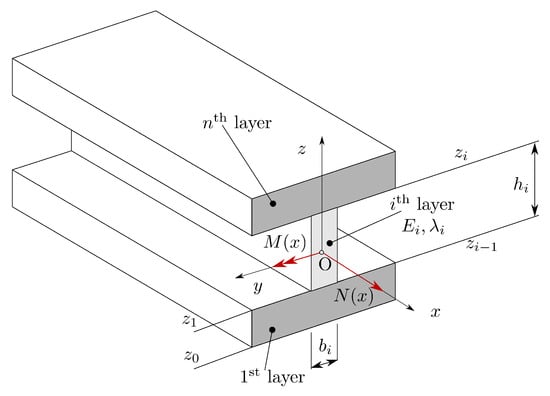 The present section defines assumptions regarding the geometry for beams assembled of n layers of different materials (Figure 1). Bending in the plane is analyzed by means of the Bernoulli–Euler formulation. We select the x-axis as the longitudinal axis, while the vertical position of the origin of the coordinate system is situated at the geometric centroid of the cross-section. Therefore, some layer is represented by the rectangular cross-section of height . It is assumed that coordinates and define the upper and lower side of layer i. The width is defined in the y direction, i.e., orthogonal to the bending plane. Indices throughout the paper denote the layer number and are not used in the sense of the Einstein summation convention. The beam’s length is denoted by L.