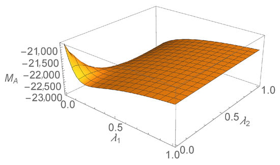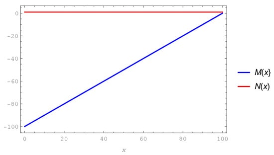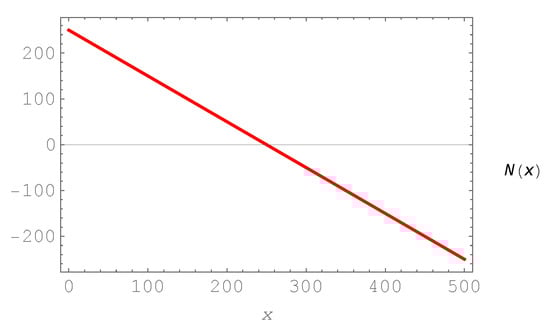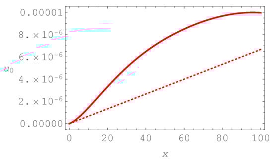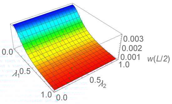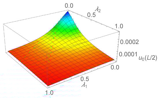 The distribution of the axial displacement along the beam is given in Figure 8. The middle point of the beam () experiences the largest displacement, while the ends fulfill prescribed boundary conditions. Next, the movement of the middle point is analyzed for dependence on the nonlocal parameters (Figure 9). The increase in either nonlocal parameter does lead toward maximal axial displacement converging toward a limit value. The linear distribution of the normal force along the beam is defined as nN (Figure 10). Support reactions are obtained as nN and nN.