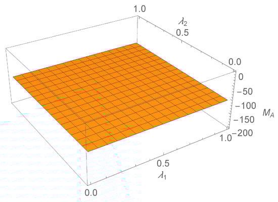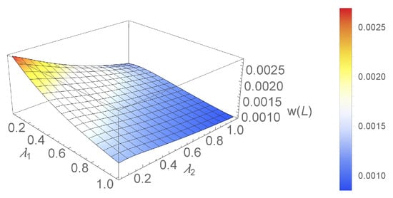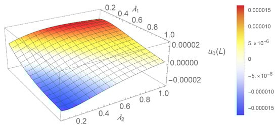 The problem was solved by the aid of Wolfram Mathematica software. The specific form of the function describing the axial displacement is too long to be presented here in detail. Instead, the graphical representation is provided in Figure 2. It is well known that the local formulation exhibits linear behavior. In the nonlocal formulation marked curvature is observed providing a nonlinear distribution. Similar effects are noted elsewhere [,] in the presence of thermal effects. If the nonlocal parameters are allowed to vary, the obtained surface describing the maximal elongation of the beam can be graphically presented (Figure 3). Smaller values of nonlocal parameters lead toward steep surface’s gradients, but as the nonlocal parameters are increased the effect diminishes. Interestingly, for a certain choice of nonlocal parameters average axial displacements, take negative values, although the nanobeam is loaded by the tensile axial force. This is a direct consequence of coupling terms associated to and the neutral surface shift. Finally, the distribution of the normal force along the beam nN is constant as expected (Figure 4).