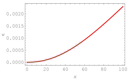 The curve representing the deformed shape of the beam for given nonlocal parameters is provided in Figure 5. The expected shape is obtained. The maximal transverse displacement at the beam’s tip for different values of the nonlocal parameters is given in Figure 6. Similar conclusions about gradients as in the case of longitudinal displacement can be drawn. The bending moment is distributed linearly along the beam (Figure 4). The moment is recovered in the post-processing from Equation (22) as nN nm.