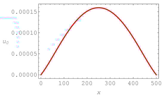 To obtain the axial displacements, the stationary conditions is applied. With the total energy potential in Equations (24) and (13) and the strain in Equation (8), it follows that
